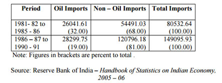 “Throughout the eighties, all the important indicators of fiscal imbalances were on the rise. These were the conventional budgetary deficit, the revenue deficit, the monetized deficit and gross fiscal deficit. Moreover, the concept of fiscal deficit is a more complete measure of macroeconomic imbalance as it reflects the indebtedness of the Government. This gross fiscal deficit of the Central Government has been more than 8 percent of GDP since 1985 – 86, as compared with 6 percent in the beginning of 1980s and 4 percent in the mid – 1970s.” - Increase in Non-oil Imports: The trends in imports and exports show that imports rose much faster than exports during the eighties. Imports increased by 2.3 percent of GDP, while exports increased by only 0.3 percent of GDP. As a consequence, trade deficit increased from an average of 1.2 percent of GDP in the seventies, to 3.2 percent of GDP in eighties.